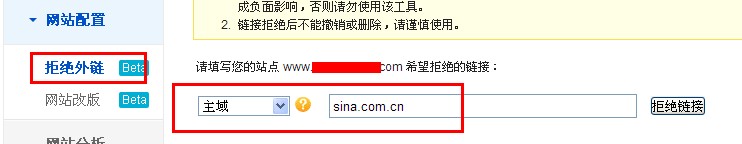 二、网站降权后的应对措施 笔者大致分析该站的数据后,给朋友如下建议。 1、小调网站首页title,如以前的title为“退热贴|小儿退热贴|小儿退热贴oem……”就可以改成“小儿退热贴|小儿退热贴oem……” 2、网站恢复前期,90%的时间与精力花在网站内容建设上,前期的外链主要是吸引蜘蛛过来爬行与抓取。网站内容建设分为适度删掉以前转载文章,与稳定与有频率的更新相关原创文章。 3、用百度站长工具的“拒绝外链”功能,向百度提交各主要垃圾外链。如在新浪博客、凤凰博客、中金博客等平台发布的大量垃圾外链,就可以直接拒绝掉,如下图所示。