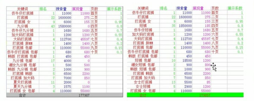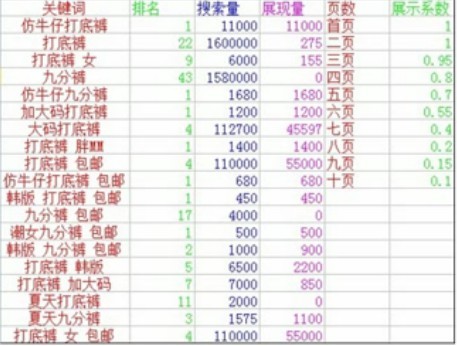 在过去的一年里(2012年)受全球经济增长迟缓的影响,虽然中国电子商务市场整体增速整体有所回落,但是依然还是处于上升阶段。据艾瑞网统计数据显示,2012年中国电子商务市场整体交易规模为8.1万亿元,增长了27.9%.这说明一个问题就是:电子商务市场虽然增速变缓,但是其市场还远远没有达到饱和状态。所以想在电商领域开辟一片自己天地的朋友们还是有机会的。 作为电商领域的龙头老大——淘宝,在过去的一年里也依然领跑在先。在这个最大的平台上,也活跃着全国500多万淘宝卖家,其中绝大部分都是属于创业期的中小卖家。在如此庞大的人群中如何能脱颖而出,如何获得更多的机会成了每个中小卖家不得不思考的问题,在没有强大的产品团队,没有雄厚的资金保障的情况下,很多中小卖家都把眼光放到了自然流量这块蛋糕上。今天清晨就来给大家分享点经验,让那些没有技术的小卖家们获得更多的机会。 自然流量的核心是什么?是流量!基础是什么?是标题。 两个简单的问答,让标题优化的重要性凸显无疑。 所谓的标题优化其实就是让标题获得更多的展现机会,获得更多的点击,从而提高它的点击率。如果在点击率一定的情况下。都有哪些因素会影响到标题的展现量呢? 1. 标题中关键词的个数 2. 每个关键词的排名 3. 每页的系数(系数:宝贝在不同页被买家看到的几率大小) 4. 关键词的搜索量。 知道了影响标题展现量的几个因素,我们很轻易的就获得了标题优化的思路。 1. 给标题拆分关键词。将三十个字的标题拆分组合成尽量多的关键词。 2. 将关键词按展现量排序 3. 去掉没有展现或者展现最少的词,更换新的关键词。 可能这么干说大家会有点不明白,下面我们通过一个宝贝标题案例来理解: 仿牛仔夏天打底裤 女 韩版 潮女九分裤加大码打底裤 胖MM 3条包邮 下面我们来看下这个标题的各项数据: