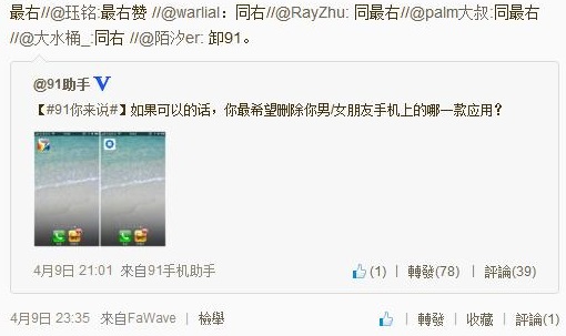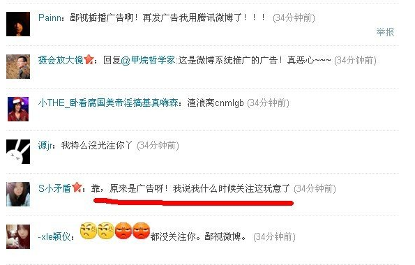 如果要对其卸载有三种方式:第一不得不忍痛重新刷机,第二从PC端91助手黄金版来删除手机版,第三通过Cydia的管理功能来进行删除。无论从哪种方法来讲,都让用户感觉很厌烦,很想骂这款应用的开发工程师,你们到底想干什么? 更有趣的是就在2013年4月9日,91助手通过发表微博来进行调查,内容如下“#91你来说#”,如果可以的话,你最希望删除你男/女朋友手机上的哪一款应用?,众多网友回复就是91手机助手,面对如此尴尬的问答,不知道91手机助手是否能痛改前非? 新浪微博密集广告强发送 招来众多网友吐槽 2012年年底新浪微博正式上线新的信息流广告微博粉丝通,据悉粉丝通的广告形式与之前新浪微博推出的粉丝头条类似,都是该广告信息会置顶在用户信息流当中,所不同的是粉丝头条是针对企业微博的粉丝,而粉丝通可以针对全网的微博用户投放,企业客户可以根据用户的性别、地域及其他属性进行定点投放。