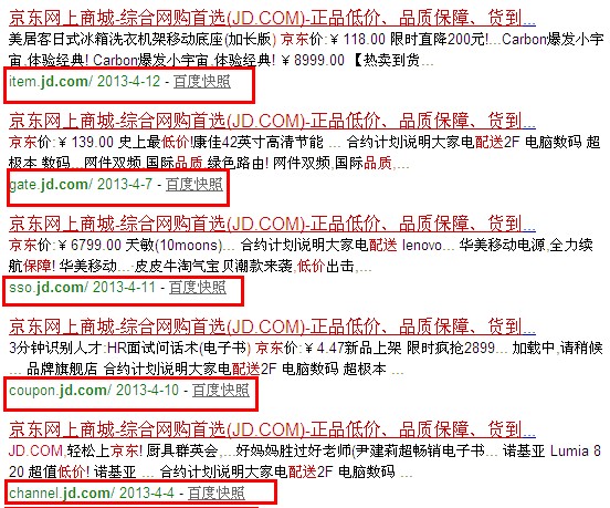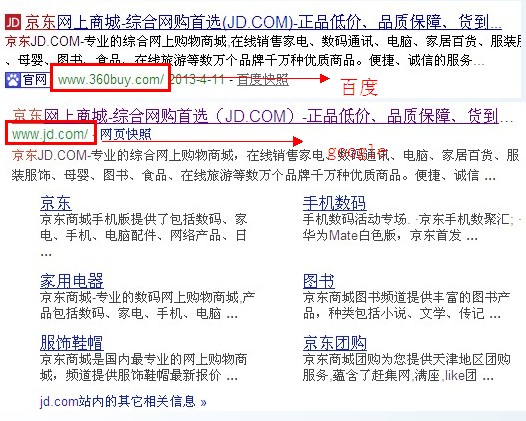 京东商城,360buy域名换成了jd,相信很多人都知道了吧,当发布这个消息的时候,京东声称说,为了减少对于搜索的依赖,个人觉得是为了撇清和360系列的任何关系,记得有这样一个笑话,说,360buy是不是360旗下的购物网站啊,然后很多人都跟风说,是的,说360不是安全吗,然后buy不是购买吗,于是乎成为了安全购买的一个标明词了,这次京东下定决心换掉域名,也是为了让自己的品牌走起来,脱离各种负面的影响。那么这里呢,就说说换掉域名的那些事儿吧,也是今天观察得到的一些系列。 一:百度和google的跳转反应状况 如图,看到百度和google的跳转了吧