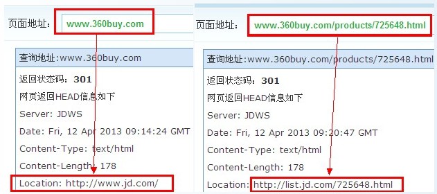 这样一种全首页,是不是会发生在京东的身上呢?至少在现在为止还没有出现大流量的曝光情况,在百度对于301这样的今天,是不是会在下次更新的时候出现大的浮动呢? 二:京东商城的跳转形式 一直都想说一下京东商城,这次更新域名的跳转格式,下面是一些简要的分析,如图,所示,是那些对应的一些调整