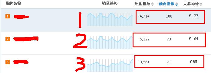 其次关键词的热销指数、倾向指数对比分析、同样以下图为例,通过对比热销指数和倾向指数,我们可以很容易判断出产品一的喜欢人数远大于产品二的人数,说明产品一的本身质量颜色方面很可能非常受用户喜欢,但产品二的价格让它的热销指数又远远高于产品一,这就又说明用户虽然说喜欢好的产品一,但是只要质量差异不大的,消费者还是更愿意选择性价比高的产品二作为消费的。那么产品三的店铺玩家其实就可以通过点击品牌名称,看到以上前二位产品的产品图片风格和哪种价位搭配更符合用户需求,进而提升自己产品的品牌竞争力。打个比方:点击品牌一我们看到的韩版红黑相嵌的运动服是该店的主打产品,打开品牌二我们看到图片上的价格便宜而且包邮,那么你作为品牌三,你是否就可以吸取2家的长处,运用到自己的产品上呢?