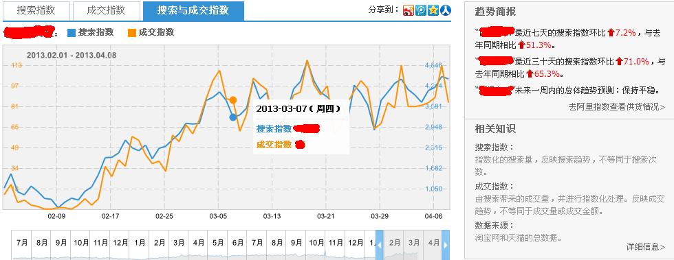 在上一节如何玩转淘宝指数(一)的内容中,万悦教了大家如何通过淘宝指数的数据,来定位价格引导客户的简单方法,今天我来跟大家讲解,如何通过淘宝指数看透关键词。但在讲之前,我要告诉大家的是,如果大家好好学习肯定会对你店铺流量效果有一定影响并且能产生订单。当然,最终能否成为订单,除了今天讲的这个环节外,还有其他关键的环节我会在下节继续跟大家分享,好现在我开始进入今天的正题: 首先关键词的搜索与成交指数趋势,为什么要看时间?很简单一个产品的周期有旺季和淡季,如果你在产品的消费淡季时间里,拼命的在淘宝付费推广平台上砸广告费,在面对本来消费淡季客户群体减少,商家并没有减少的情况下,你的付费推广在高峰期和低潮期效果可想而知。所以,简单的搜索指数和成交指数,是你开淘宝店铺必看的。而搜索指数与成交指数的上下交错数据,也是可以值得深究的。在这里就不详叙了,需要了解的可以再找我单独交流。