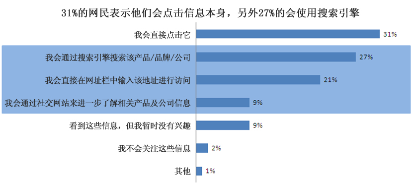 这项调研说明了在线品牌信息展示对于驱动搜索引擎的力量,并显示了搜索引擎在提高在线品牌推广效率方面的作用,同时二者对营销策略的影响也很大。两者的结合将大大提高搜索引擎营销的效率。 而网盟推广的展现方式上类似于在线品牌信息展示,计费上类似于搜索推广的按点击计费,因此,网盟推广的效果除了目标用户产生点击后引发的销售外,还有推广信息的展示价值。 另外,从部分用户的购买决策流程分析:当他们在内容网络上浏览信息时,看到推广信息的多次展示,加强了推广商户对于产品的品牌认知,在实际有购买需求时通过搜索引擎需求产品信息,产生购买。 调研结果显示:品牌的推动力对于消费者的购买选择影响是至关重要的。33%的受访者认为他们会认购他们熟悉的品牌,这个几率是那些未知品牌购买率的两倍。 广告圈认为从用户的典型网上访问和购买决策行为上我们可以看到,销售推广与网盟推广的良好结合,可以帮助我们提升推广的效果。