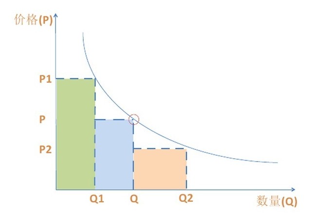 如果成本在可控范围内,那都会选择把价格定在靠近中间的位置,因为这样 交易额= 价格x 数量 的面积最大。如下图: