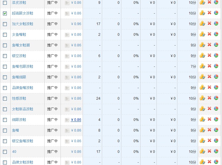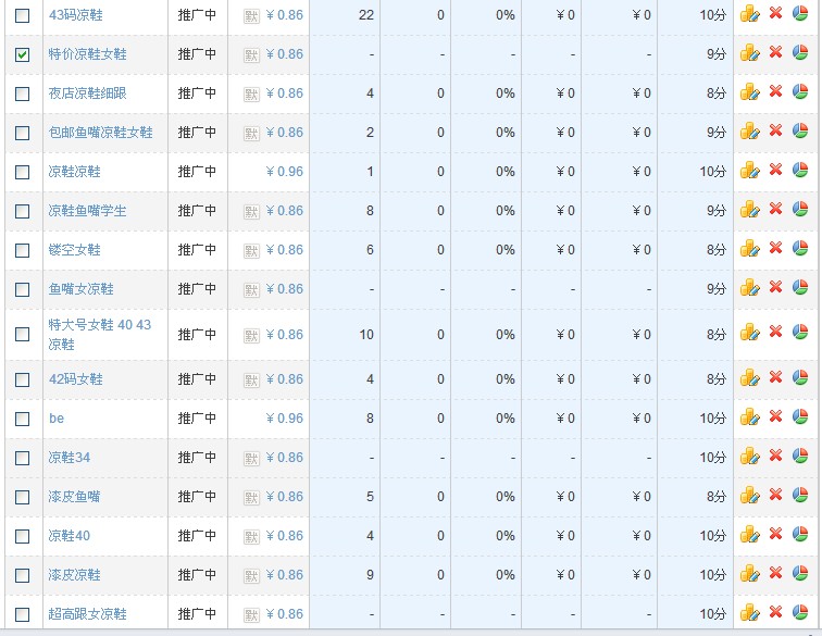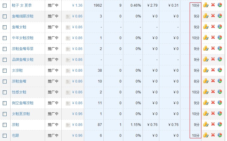 直通车推广的宝贝都在这里了。推荐的词和首页是不一样的。其他地方自己去体验。 关于养词,经常听说,但没人告诉我怎么养,养多久才能养大?我个人认为,一般养词一个星期就可以看到效果了。你要是养一两个月,那你的夏装估计得秋天穿了。 如何在养词过程中提高质量得分? 新推广的宝贝质量得分是不会太高的。传说中自己或者找人点击直通车可以提高质量得分,个人不推荐这样做。一是浪费钱,再有就是你丫不累啊! 质量得分每天凌晨更新一次,注意查看。 下面讲个这两天做的一个案例。最近离职了,自己开了个小店赚点外款。其实我是做运营的,有兴趣的朋友可以关注下我的微博 欢迎推荐工作。 店是5月几号开的,上了100款商品,花了3天时间装修了店铺和商品优化。然后挑了几十款上车。新的推广计划基本设置在5到8毛钱之间。一个星期后从里面找出质量得分高的宝贝.