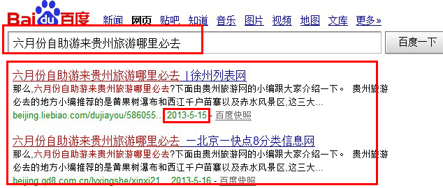图:4 举个例子:笔者将一篇旅游类型的文章发布在了列表网里,到了第二天早上将发布的URL复制到百度的搜索框里百度一下,看看是否被收录,如果收录就证明你网站多了一条外链,笔者建议这样的方法要长时间养成一个习惯。 以上则是贵州旅游原创编辑,上述是笔者在做旅游网站的时候自己总结的外链建设心得,目前百度的外链政策非常严格,一不小心可能就会造成作弊的现象,但对于旅游网站的外链笔者认为分类信息网是最适合不过了,其中最让笔者认为的是分类信息网没有被百度归纳为作弊外链里面。最后笔者祝愿广大地方旅游网站能够在今年有一个好的盈利。 (责任编辑:admin) |