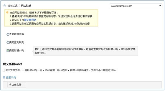 (2)提交新旧url对方式: 在改版工具页面中选择“提交新旧url对”方式之后,可直接上传txt文本格式的url文件,需要注意文件的格式“一对新旧ur为一行,旧url在前,新url在后,用tab隔开,再换行。文件大小不能超过10M”。