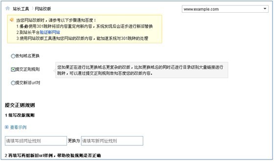 2、网站进行复杂改版 如果网站的改版比较复杂,比如目录级别大量链接进行跳转,可通过“提交正则规则”或“提交url对”向百度提交改版规则。 (1)提交正则规则方式: 在改版工具页面中选择“提交在正则规则”在下方的改版规则框中通过填写改版前后对应的正则表达式,之后还需要在填写两组新旧url示例,帮助校验改版规则。