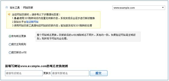 A5站长网(amin5.com)5月21日消息,今日百度站长平台上线网站改版工具升级版。此次升级后,改版工具可支持所有的改版形式,并且改版规则的填写提交更便捷。所有网站在百度站长平台上完成验证之后,都可以方便快捷的使用该工具,帮助网站运营。 百度站长平台目前已经推出数款站长工具。有数据提相关的Sitemap、死链提交、URL提交;网站配置相关的拒绝外链、网站改版;网站分析相关的外链分析、百度索引量、搜索关键词、页面优化建议、抓取异常、压力反馈、Robots;网站安全相关的安全检测、漏洞检测;以及百度统计、开放适配、站内检索、Site App、Ping、搜索代码、百度分享等其他工具。此次网站改版工具升级将进一步帮助网站进行改版。 详细公告如下: 各位网站管理员, 很高兴的通知各位,网站改版工具升级版已上线。网站改版工具在beta版期间收到了很多站长宝贵的建议和意见。此次升级后,改版工具可支持所有的改版形式,并且改版规则的填写提交更便捷。所有网站在百度站长平台上完成验证之后,都可以方便快捷的使用该工具,帮助网站运营。 本次工具升级亮点: 1、支持提交正则规则: 如果正在进行比更换域名更复杂的改版,比如更换域名的同时还进行目录级别大量链接进行跳转,可以通过提交正则规则告知百度您的改版内容。 2、支持上传新旧url对: 当改版工具提供的其他方式不能解决您的网站改版问题时,可通过直接提交改版的新旧url对,告知百度您的改版内容。 网站改版工具地址: 一、网站改版工具使用规则介绍: 1、只更换域名(即改版前后的url长相除站点不同外,其他均一致) 首先确保新旧网站在百度站长平台上均已验证,然后在网站改版工具页面中选择“域名更换规则”选项,从已验证网站列表中选择新网站,点击提交即可。提交后注意关注系统反馈的校验信息,校验周期一般为一周左右。
