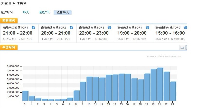 这些关键词都是搜索量大,且和宝贝不冲突的相关关键词,把这些关键词全部融合到一个标题里面,“秒杀包邮!原创苹果iphone4 4s手机壳保护套ipone4外壳套壳子”刚好64个字符,32个汉字!注意加上营销关键词,标题要通顺。这个标题囊括了记事本里面所列出的所有关键词,当你的一个关键词出现在所有宝贝排名首页的时候,其他关键词也差不多会出现在相同位置附近,这样我们就多了很多关键词入口。 二、上下架时间和橱窗推荐 上下架时间和橱窗推荐,关系到宝贝是否能够出现在所有宝贝排名中的前几页,宝贝在做了出橱窗推荐的前提下,离下架时间越近,排名就越靠前。所以宝贝上下架时间,非常关键,我们可以利用数据魔方中的“买家什么时候来”,来观看自己所在类目的流量高峰时间段。