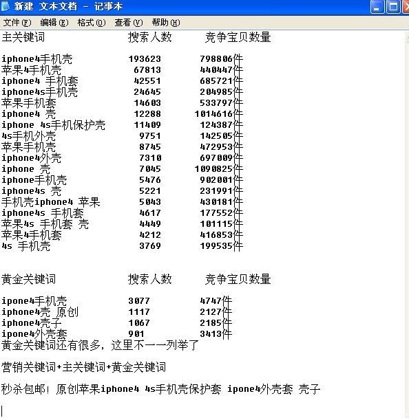 然后在这500个关键词中找出搜索量巨大的主关键词,和搜索量还可以,竞争却非常少的黄金关键词,然后用记事本列出来,融合出一个标题。如图所示