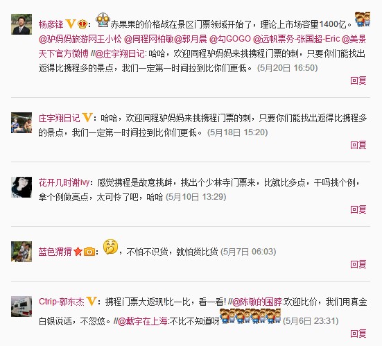 同程网和驴妈妈旅游网的官方微博均及时作出了常规的客套回应。随后,5月6日,携程副总裁郭东杰转载比微博,肯定了携程门票大返现活动。5月18日,携程商旅副总裁庄宇翔微博回复中表示:“欢迎同程驴妈妈来挑携程门票的刺,只要你们能找出返得比携程多的景点,我们一定第一时间拉到比你们更低。”矛头直指同程和驴妈妈,引来众人围观。携程至今仍然是在线旅游的霸主地位,对于景区门票市场,携程虽然动作比同程驴妈妈晚了点,但此次携程的全员应战态度和气势,显然让门票市场的先行者们感到了阵阵寒气。