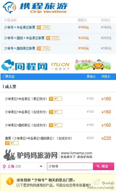 在刚过去的五一小长假,伴随着携程“全球门票预订平台”全新上线,并推出“全球门票60天返1000万”的优惠大促销活动,与此同时,驴妈妈旅游网和同程网均宣布启动返现让利促销活动。在线旅游门票大战自此拉开帷幕。 让我们来看看门票大战微博上的一个小战场的场景。5月初微博网友 @aaiqijs的一则微博表示“我说这年头儿啥都返现到底是不是真的?连买个门票也开始返现了,看看少林寺,携程最多一张票都能返20块呢!跟同程的返1块钱,驴妈妈的查无此票相比,真是赤裸裸的竞争力!强烈建议做好攻略去旅游,将比价的优良传统进行到底!”并贴出了携程、同程网、及驴妈妈旅游网对某景点的搜索结果对比。(如图所示)