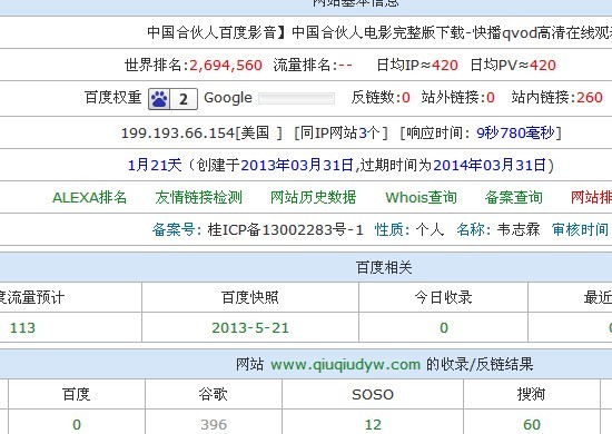 看到了没。。这个站是3月份底建的,这个时候中国合伙人的指数很低,这个家伙直接做的长尾词“中国合伙人百度影音”,百度默认为了这个站是早期的原创者之一,所以他能在这么多高权重的老站中,在收录仅仅只有一页的时候却能在指数25000左右的关键词中排名在首页。。。看到这里,大家应该能明白我想说的吧,不过这样的站是不稳定的,除非他能坚持新的原创,否则势必会被慢慢淘汰在后面。 总的来说百度更加重视了原创,更加的关注了算法的更新,但是大动作背后遗留下的些细节却令人深思,就像一个很会打胜仗的将军,但是没有好的后援,又能怎么样呢?希望百度能在快速前进的同时也能及时的处理所带来的负面效应,这样才不会让我们这些草根站长们心寒。 今天思绪很乱,先说到这里吧。。希望爱好SEO优化的朋友们能和阿恒多多交流! 本文由阿恒原创发布,转载请注明:温州网站建设 (责任编辑:admin) |