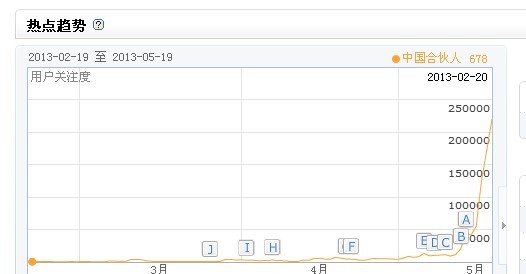 从上图大家可以看出“中国合伙人”这个词在3,4月份的开始有指数的,指数非常低,在这个时候你做这个词作为关键词来操作的换,应该会被百度认为算是原创的,最起码也算是早期的原创者了。。等到5月再做这个词的话估计你很难再做好的排名上去了,下面这张图大家可以看看: