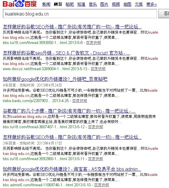 百度上周发布了判断外链的方法,让大家对外链有了重新认识,首先很明确是指出了链接要自然,是用户自然推荐的,这样的链接才算有意义,所以我们现在如何去发好外链?签名外链似乎没有什么作用了,什么样的外链才可以去好好利用?官方没有明确指出纯文本外链是否有权重,是否有投票的性质,我们都不知道,还是得自己去实验,自己去探索。百度的排名因素都是根据千万种算法合在一起来给出排名的。下面我告诉大家怎样才能知晓纯文本是否有用?现在我和大家谈谈纯文本外链。 首先来判断纯文本外链到底是否有用,站长们有安装过百度站长工具都可以去看下,有些网站只能发纯文本外链,你可以去网站上发上十几篇,等到收录后,你去网站后台看外链来源,很明显百度是给出了你纯文本外链的域名来源,说明你所做的纯文本外链是有用。所以站长们学得纯文本外链没既不会带来投票的权重性质,也不会带来流量。所以大多数都放弃了。 再来看看我做的一个实验,我写过一软文,在文章中自然合理地加入了一个当天新注册博客地址,这个是纯文本博客地址,后来文章被许多网站转载,第二天,我去查下那个博客的收录,当天就收录了主页。我给出了截图,大家可以去分析下。这就足够证明纯文本外链还是有用的。如图: