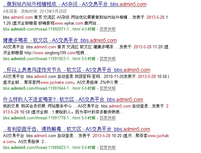 百度外链工具 从上面的外链数据我们可以看出数据相差太大,那是不是有好多外链不是被百度工具认可的外链呢?下面在看A5论坛的外链数据,A5论坛是每个站长每天都逛的论坛,做外链的首选,笔者也不例外,每天做的数据都有十几条,均被收录,看截图。