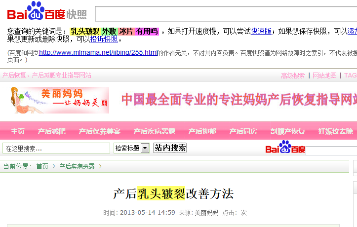 作为站长,大家都知道,页面相关性是页面排名高低的重要依据之一,相关性越高,同等条件下,排名越靠前。搜索引擎判断页面相关性的方法有两种,一是通过外链(包括外链来源网站、来源页面的相关性和链接锚文字等等);另外一种就是页面本身了,也就是页面文字。外链因素,除了自己人为建设的外链,一般不受站长个人控制。而页面文字,完全由站长个人控制,所以,要充分把握这一因素,提高页面的相关性。通过页面文字提高页面相关性,可从下面几个方面入手。 1.在页面重要位置出现核心关键词。核心关键词出现在页面的不同位置,对页面相关性的贡献是不一样的。出现在页面中的几个重要位置,如正文前部(最好第一段第一句话中)、正文尾部(最好组后一段中)、H1、H2标签以及黑体标签中,对页面相关性最大。所以,如有可能,一定要将核心关键词部署在这些地方。 2.布置核心关键词同义词和相关词。这里的同义词,是广义的同义词,包括同义词、近义词、同样事物的不同称呼和变换说法。在页面中部署核心关键词同义词和相关词,第一,提高核心关键词的语义相关性;第二,提高页面对应的搜索词广度。例如,“产后如何减肥”为核心关键词,则可在页面中也加入“产后减肥方法”“产后如何瘦身”“产后减肥指导”这些词语。这样的话,当用户搜索“产后如何减肥瘦身”产后减肥瘦身方法”这些词语的时候,比起没有“产后减肥方法”“产后如何瘦身”这些核心关键词同义词的情况,页面相关性会更高。 提供一个实例,证明这么做的作用到底有多大。图示页面一的核心关键词为“产后 乳头皲裂改善方法”(也是图示页面的标题),用户输入的搜索词为“乳头皲裂外敷冰片有用吗”,虽然页面标题不含有“外敷”和“冰片”,但页面内容中含有这些词语(如图二所示),因此,排名在第二页;而搜索“产后乳头皲裂改善方法”这个本页面的核心关键词,排名却在10页之外。