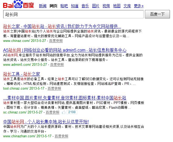 今年以来百度相继推出绿萝算法与石榴算法,这两个算法对中文互联网的影响都很大。从这几天到相关站长、SEO相关的论坛里的声音可以看出来,很多人都对这样的算法很不满意,都认为有失公正。甚至直接的导致了很多人失业或是转行了。 这几天也有很多人一直在讨论着现在的SEO的出路和方法,也有很多人在为很多SEO从业者做职业上的指导,都是乱七八糟的说着该怎么怎么的。我想对那部份SEO从业人员说:适合自己的就是最好的。“仁者乐山,智者乐水”,每个都有不一样的想法是马是骡都要带着来溜溜。 今天在这里我探讨的是颜色在SEO的中作用。 大家都知道给相关的字眼加上颜色是为了引起读书的注意,是为了突出和强调该内容的重要性。那么,在搜索引擎的眼里是不是也是这样的呢?下面我来看各大搜索引擎在返回的结果里是怎么样突出用户搜索引擎的关键词的 1、下图是在百度中搜索“站长网”,百度搜索结果返回页返回的结果页面。